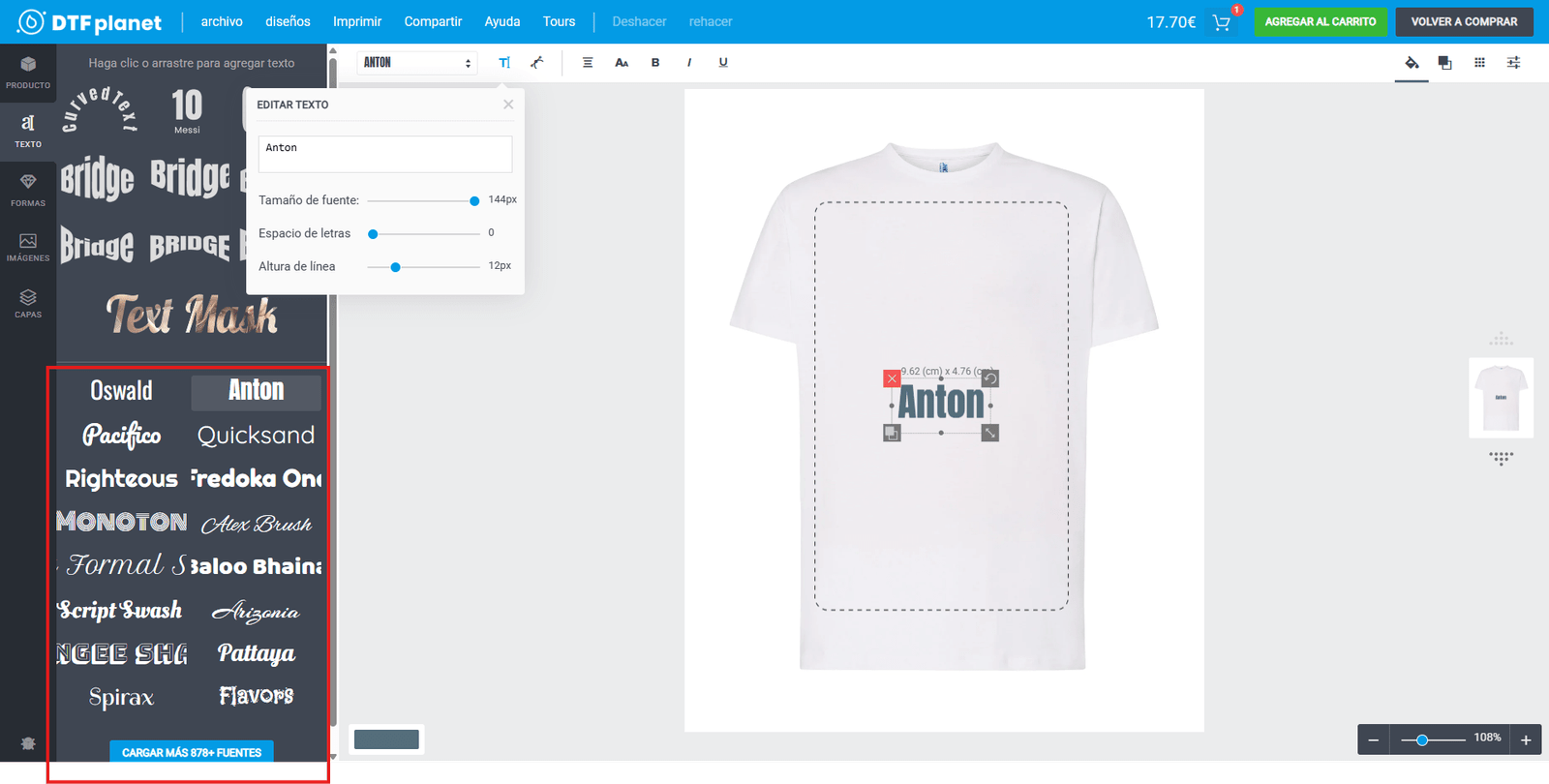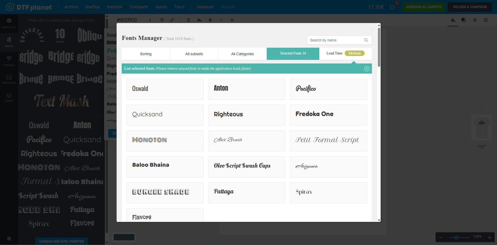 En la barra lateral, si seleccionas una de las fuentes, ésta se añadirá al lienzo del producto. En este apartado dispones de una preselección de fuentes con las que poder trabajar, sin embargo gracias a la integración completa con ‘Google Fonts’. podrás agregar la fuente que desees, pulsando sobre ‘Cargar más fuentes’.