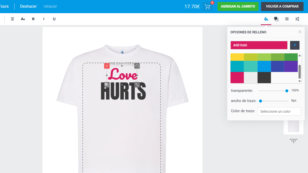 Una vez dentro del editor online, y dependiendo del producto elegido, deberás especificar color, talla y el área de impresión. Además, no te olvides de indicarnos cuantas unidades vas a necesitar.