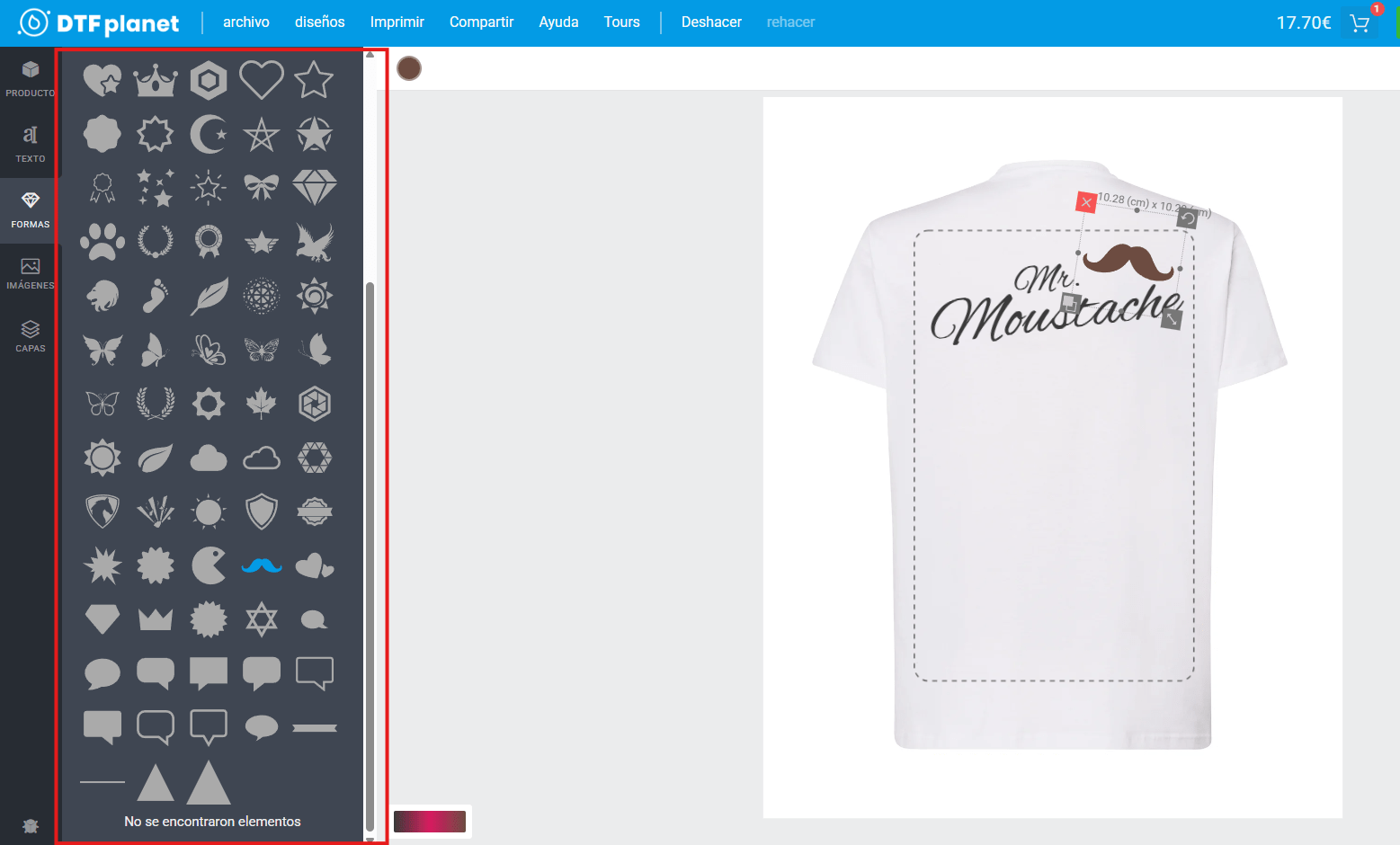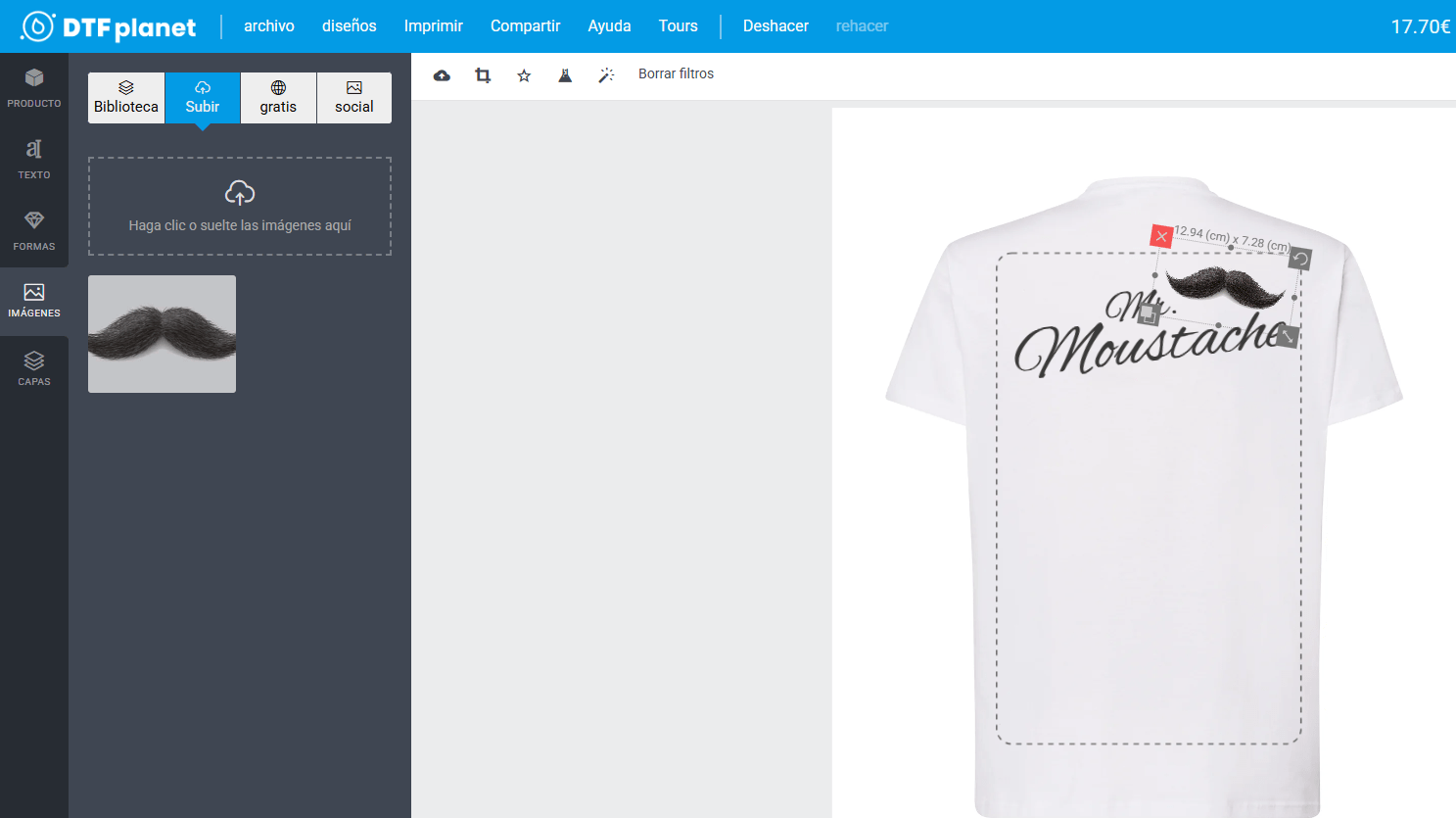 Gracias al gestor de imágenes, puedes subir tu propio diseño, o cualquier imagen para tu creación. Aquí, hemos sustituido el bigote vectorial por una ilustración.