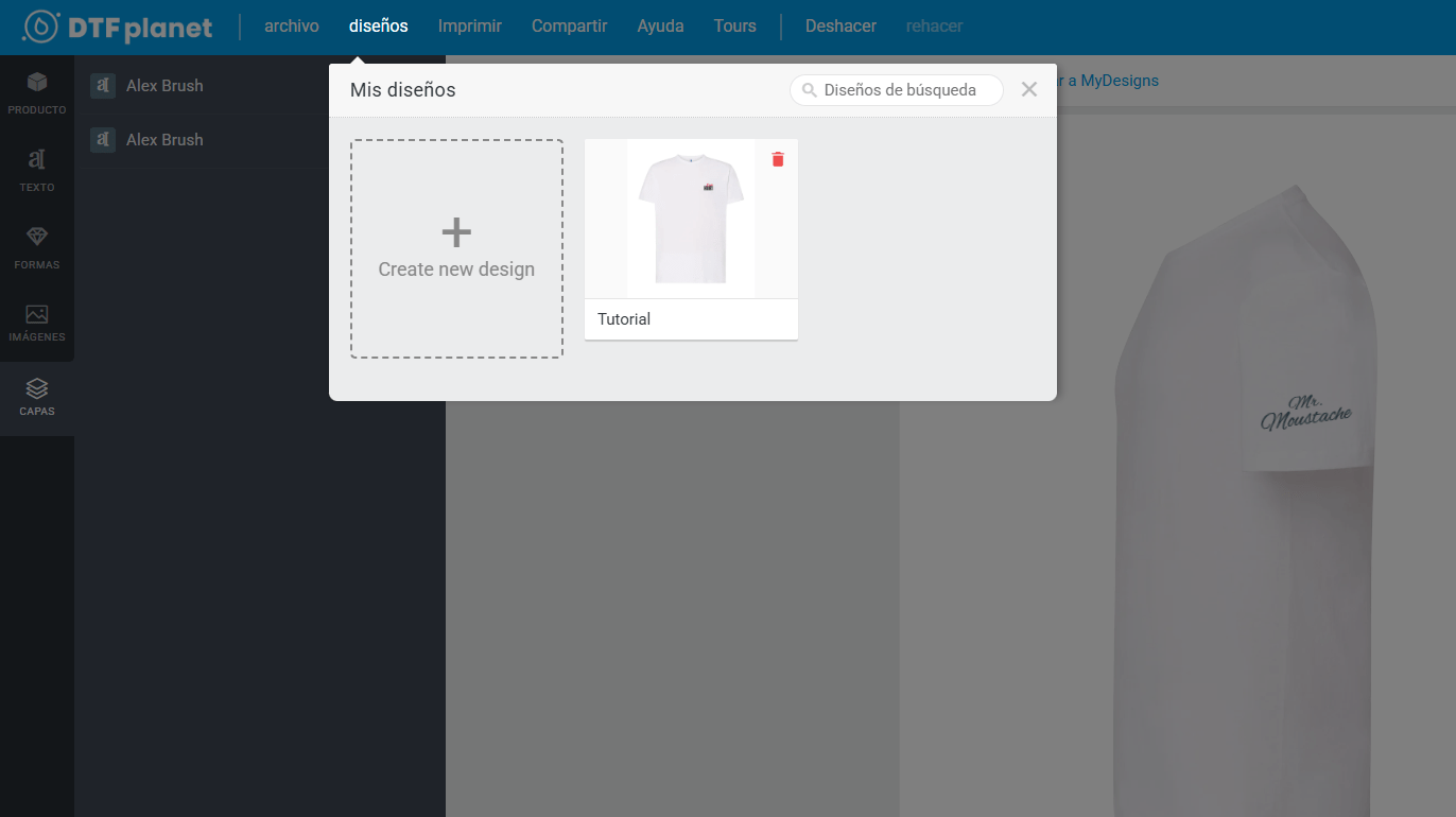 Cuando tengas tu diseño listo puedes guardarlo seleccionando en la barra superior ‘diseños’. Esto te ayudará a crear diseños alternativos, como por ejemplo, camisetas para una despedida de soltero, donde la camiseta del novio, es diferente a la del resto.