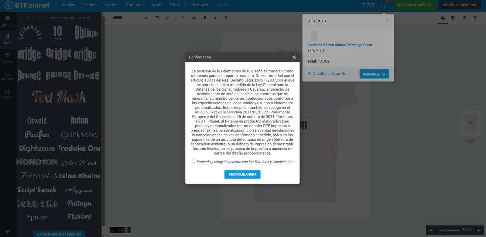 Una vez tengas listo el diseño de tu producto personalizado, agrégalo al carrito pulsando el botón, luego deberás verificar el diseño para enviarlo a producción. Es importante que sepas que una vez verificado y realizado el pago del pedido, podrás anular el pedido hasta las 10:00 de la mañana del día siguiente. Pasado el plazo no se admiten cancelaciones ni devoluciones, ya que se trata de un pedido personalizado, expresamente hecho para ti.